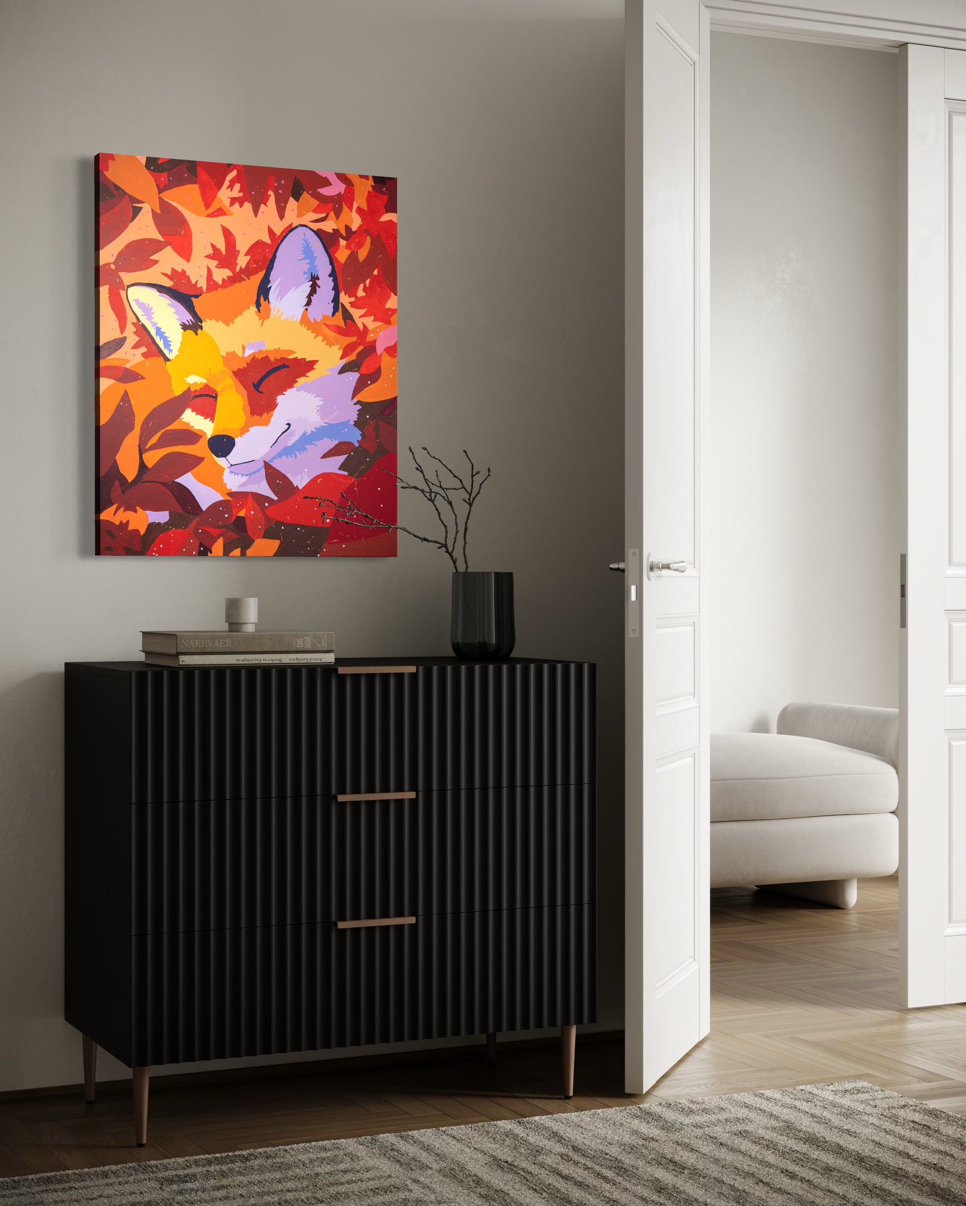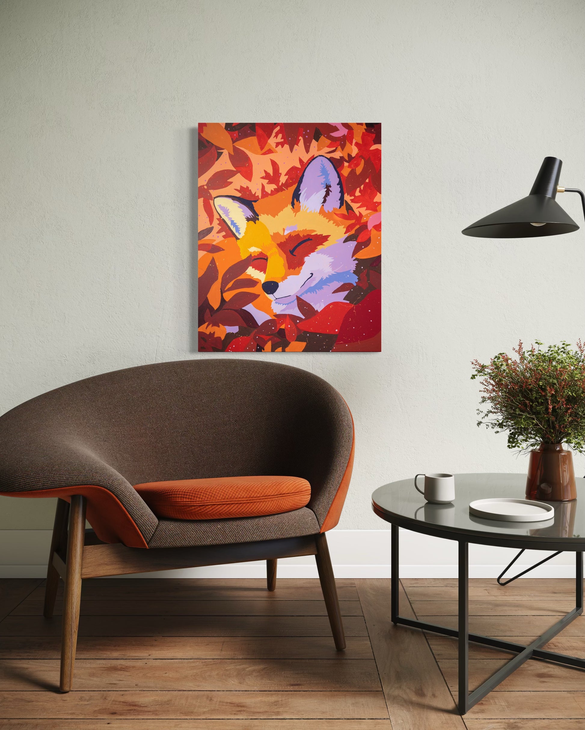 Flecks of paint flicker like wind-blown sparks, carrying the hush and shimmer of falling color without overpowering the fox hidden almost in plain sight. He rests, half-lit by the setting sun, eyes closed to the wind, content to blend into the rhythm of fall.